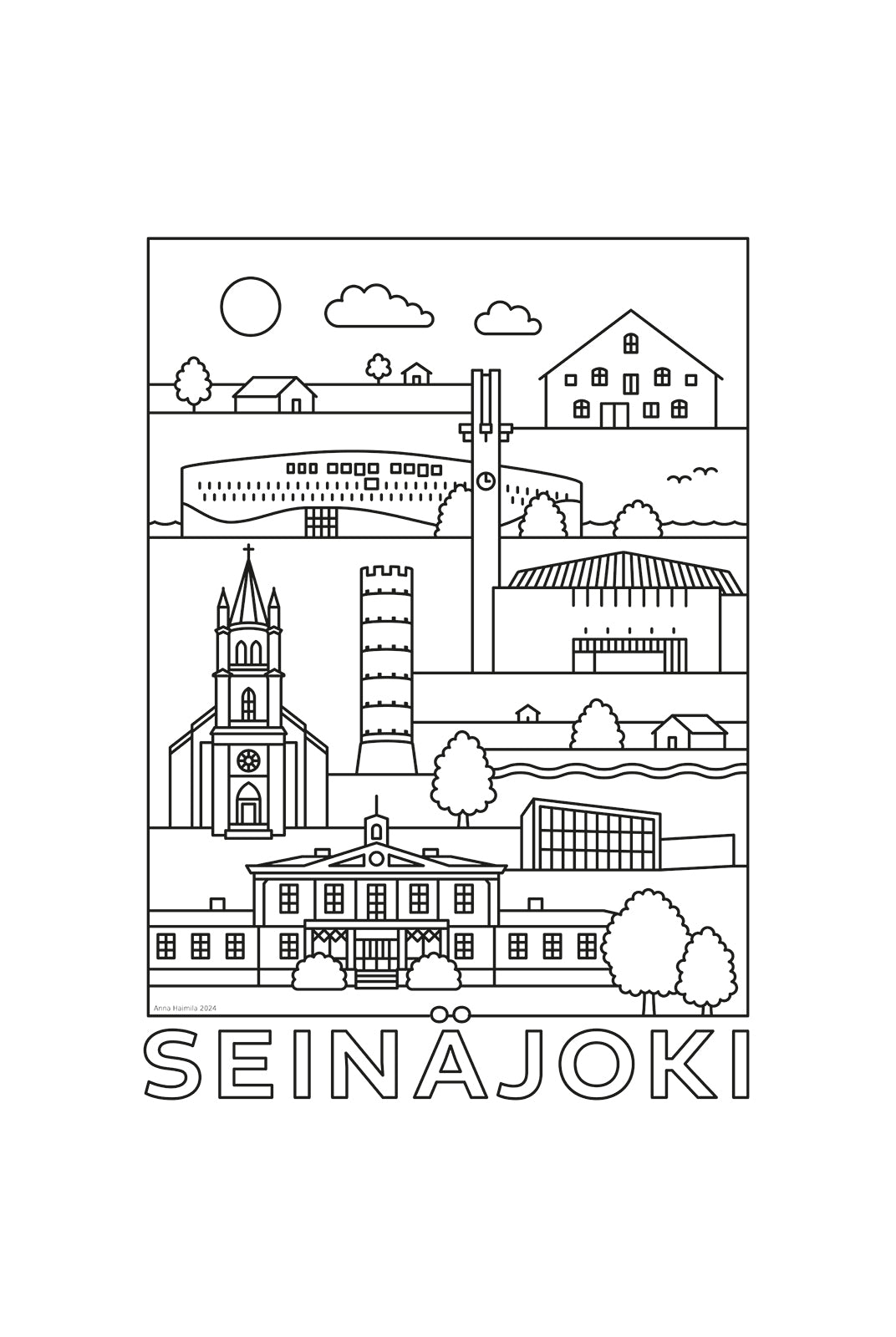 "Intohimoni on yksinkertainen ja selkeä vektorigrafiikka. Suomi on täynnä kauniita ja persoonallisia paikkakuntia, joissa on paljon asukkailleen rakkaita maamerkkejä. Olen halunnut ikuistaa näitä hyväntuulisiksi julisteiksi omalla yksinkertaisella tyylilläni. Muita työnäytteitäni ja piirustuksiani löydät verkkosivuiltani www.annahaimilagraphics.fi ja Instagramista www.instagram.com/annahaimilagraphics."